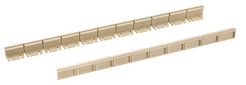 Mit diesen flexiblen ICE-Bahnsteigkanten lassen sich gerade und im Radius ausgelegte Bahnsteige in allen Breiten individuell herstellen. Zur Füllung der Bahnsteigflächen eignen sich die Gehwegplatten (Art. 180537), die Mauerplatte (Art. 170600) oder man spachtelt die Fläche zu und streicht sie mit grauer Straßenfarbe (Art. 180506 + Art. 180507).