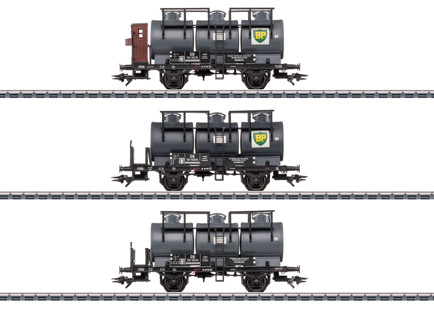 Vorbild: Drei Kesselwagen mit zwei Radsätzen und mit je drei Behältern der Benzin- und Petroleumgesellschaft Hamburg, eingestellt bei der Deutschen Bundesbahn (DB). Betriebszustand Ende der 1950er Jahre.