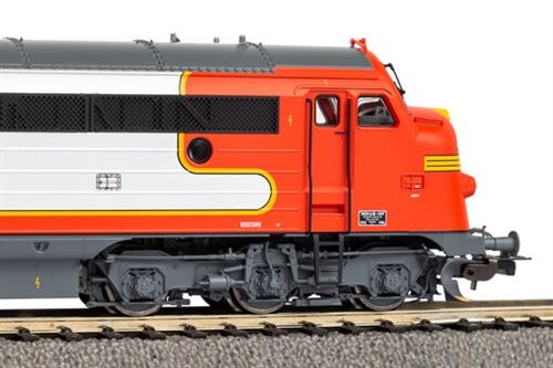Variante der NoHAB-Diesellokomotive als My 1125 im Santa Fe-Design von STRABAG in der Epoche V. Die „NoHAB“ ist zweifellos eine der markantesten Diesellokomotiven auf europäischen Gleisen. Hierbei handelt es sich um einen Ableger der legendären F-Serie des amerikanischen Herstellers EMD, die ab 1954 vom schwedischen Lizenznehmer Nydqvist och Holm AB, kurz „NoHAB“, gebaut wurde. Durch die Liberalisierung des europäischen Schienenverkehrsmarktes fanden mehrere Lokomotiven neue Einsatzgebiete bei privaten Unternehmen, auch in Deutschland, und sind teilweise noch heute im kommerziellen Dienst. Auch die PIKO-Modelle von NoHAB können von der unbestrittenen Eleganz des Vorbilds profitieren. Um diesen Gesamteindruck zu erreichen, wurde viel Wert auf Details gelegt. Die seitlichen Lüftungsgitter sind mit feinen Ätzteilen stark strukturierende Elemente im Lokkasten und ein absoluter Hingucker. Aber auch die markanten Seitenfenster vorn und die seitlichen „Bullaugen“ tragen durch ihre perfekte Ausrichtung zum hervorragenden Bild bei. Abgerundet wird der Eindruck durch die präzise und detailgetreue Gestaltung der Drehgestelle. Als Antriebskraft fungiert ein kraftvoller und laufruhiger Motor mit zwei Schwungmassen. Unterschiedliche Lichtfunktionen und der düstere Sound der Soundversionen sorgen für eine abwechslungsreiche Bedienung der Anlage. Aber auch die markanten Seitenfenster vorn und die seitlichen „Bullaugen“ tragen durch ihre perfekte Ausrichtung zum hervorragenden Bild bei. Abgerundet wird der Eindruck durch die präzise und detailgetreue Gestaltung der Drehgestelle. Als Antriebskraft fungiert ein kraftvoller und laufruhiger Motor mit zwei Schwungmassen. Unterschiedliche Lichtfunktionen und der düstere Sound der Soundversionen sorgen für eine abwechslungsreiche Bedienung der Anlage. Aber auch die markanten Seitenfenster vorn und die seitlichen „Bullaugen“ tragen durch ihre perfekte Ausrichtung zum hervorragenden Bild bei. Abgerundet wird der Eindruck durch die präzise und detailgetreue Gestaltung der Drehgestelle. Als Antriebskraft fungiert ein kraftvoller und laufruhiger Motor mit zwei Schwungmassen. Unterschiedliche Lichtfunktionen und der düstere Sound der Soundversionen sorgen für eine abwechslungsreiche Bedienung der Anlage.