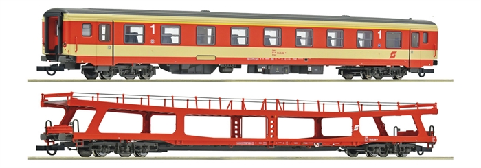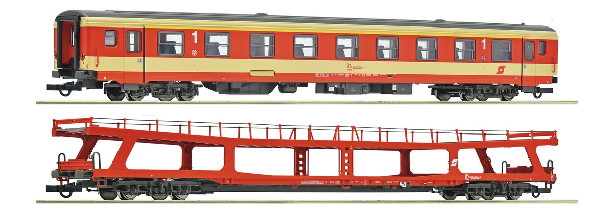Bestehend aus einem Inlandsreisezugwagen 1. Klasse, Gattung Ampz und einem Autotransportwagen, Gattung DDm.